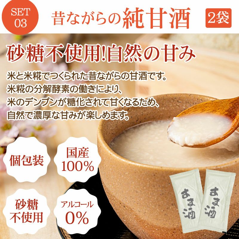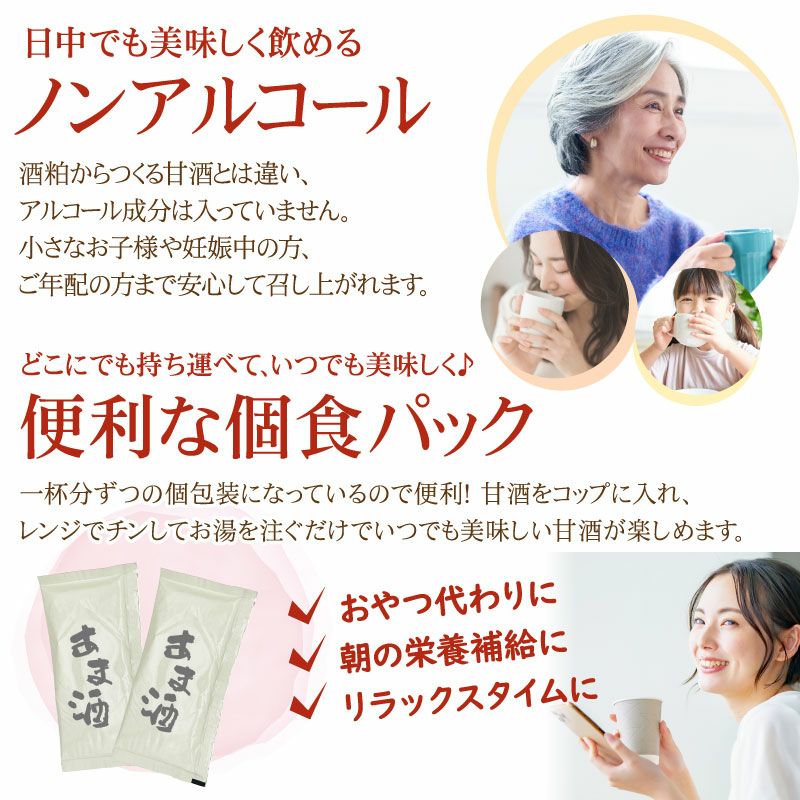 砂糖不使用。米と米糀と食塩だけで作った、自然な濃厚な甘みが楽しめる甘酒。国産原料100%でノンアルコールだから、お子さまからご年配の方まで安心してお召し上がりいただけます。