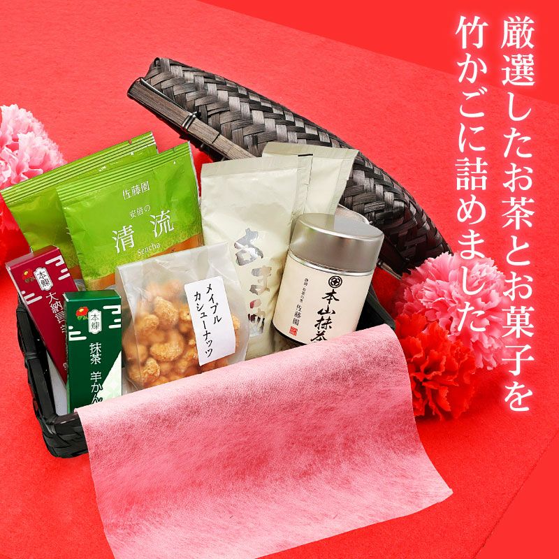 静岡でもとくに良質なお茶が育つ茶産地「本山茶」を使用した高級抹茶と甘酒スイーツをセット。ティータイムを彩るドリンクと、お茶請けにぴったりのお菓子をぎっしり詰め込みました。竹籠を開けた瞬間、思わず笑顔になること間違いなしのギフトセットです。