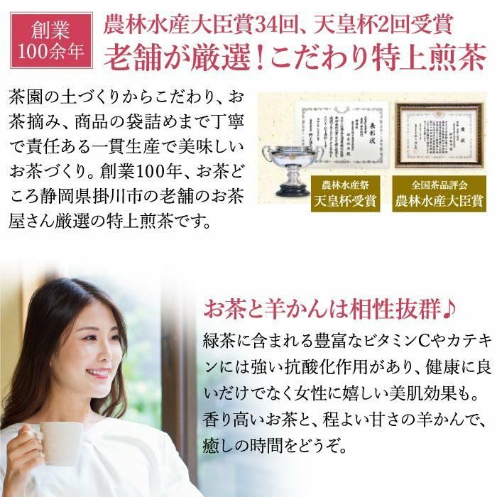 日本三大銘茶で知られる香り高く爽やかな味わいの「川根茶」と、健康効果で話題の渋みの少ない、コク深く濃厚な味わいの「深蒸し掛川茶」。茶園の土づくりからこだわる、創業100年お茶どころ静岡県掛川市の老舗のお茶屋さん厳選の特上煎茶です。