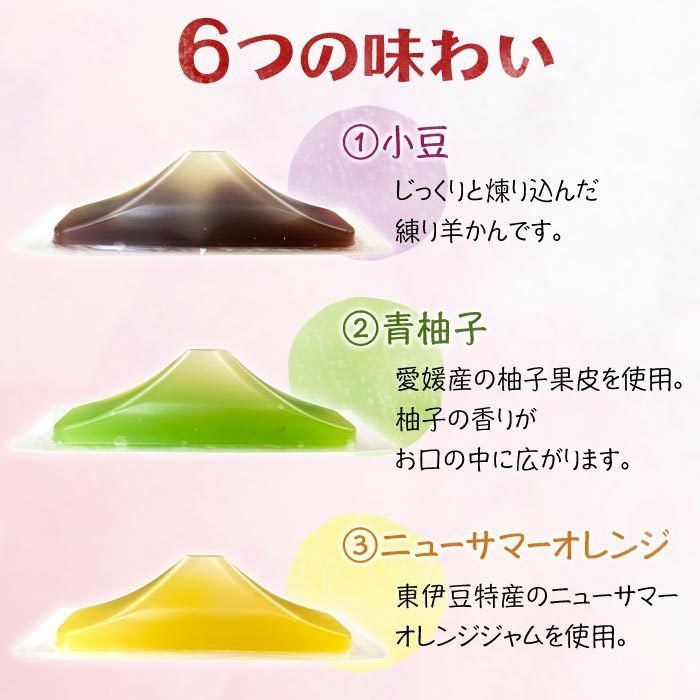 末広がりで縁起のいい、ひとくちサイズの富士山羊羹「春吉富士」は、伝統の技と富士山の伏流水でひとつひとつ丁寧につくりました。小豆、青柚子、ニューサマーオレンジ、桜葉、びわ、塩の6つの味わい。お茶の時間を華やかに彩る、材料からこだわった風味豊かな一口羊羹です。