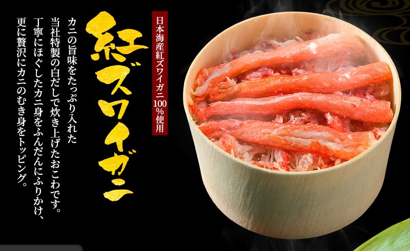 カニの旨味たっぷり!特製白だしで炊き上げたおこわです。 丁寧にほぐしたカニ身をふんだんにふりかけ、更にカニのむき身をトッピング。贅沢なカニの旨味と魚介やこんぶ、シイタケの旨みだしがおこわに染みわたっています。