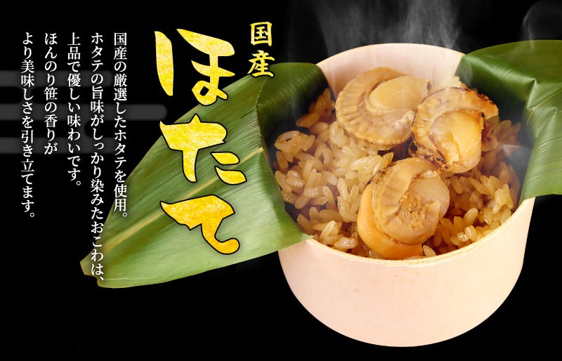 国産の厳選したホタテを使用。ホタテの旨味がしっかり染みたおこわは、上品で優しい味わいです。ほんのり笹の香りがより美味しさを引き立てます。 |