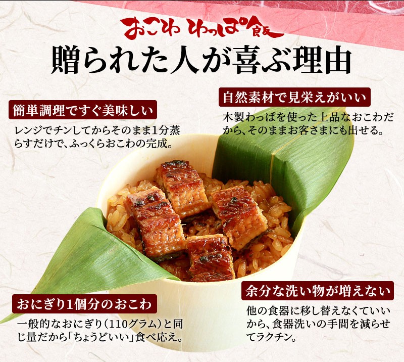 うなぎおこわ110g×1食、かにおこわ110g×1食、しぐれおこわ110g×1食、ほたておこわ110g×1食 |