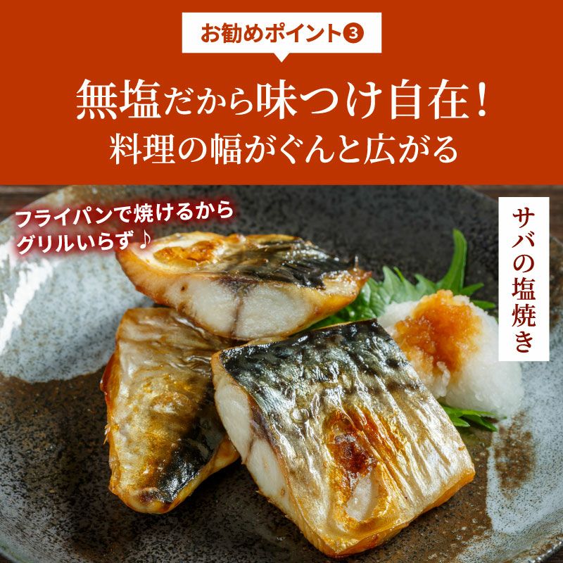 無塩だから味つけ自在!サバの塩焼き、サバの味噌煮、サバの和風パスタ、サバのアヒージョなど、料理の幅がぐんと広がります。