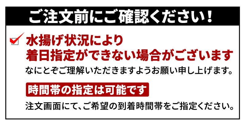 ・出荷には万全を期しておりますが、生き物のため(生きたものを出荷)、お荷物到着時に凍えて動かない場合や死着している場合もございます。その場合は、加熱調理をしてお召し上がりください。