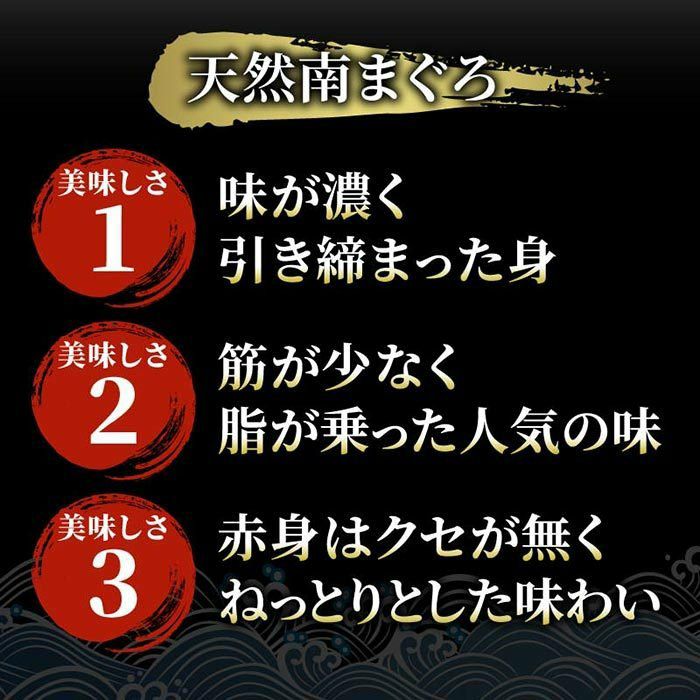 「赤いダイヤ」とも呼ばれる希少な天然南マグロ500g分の腹ナカブロック。「腹ナカ」は高級鮨店で「大トロ」「中トロ」として出される部分です。やや脂に濃厚さを感じる本まぐろのトロと比べ、上品な甘みの脂が口の中で軽くふわっと溶け、さらに甘みの強い南まぐろのトロは、焼津ならではの味です。