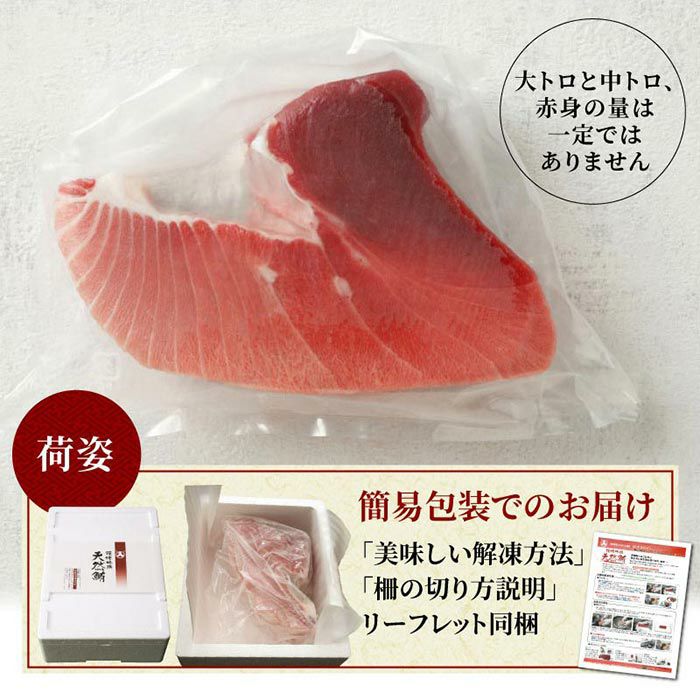 大トロと中トロ、赤身の量は一定ではありません(不定量500g)が、皮や血合は含まれません。柵どりしないブロックのままだからこそのお値打ち品。マグロの町焼津の「卸」マルイリフードサプライから産地直送。