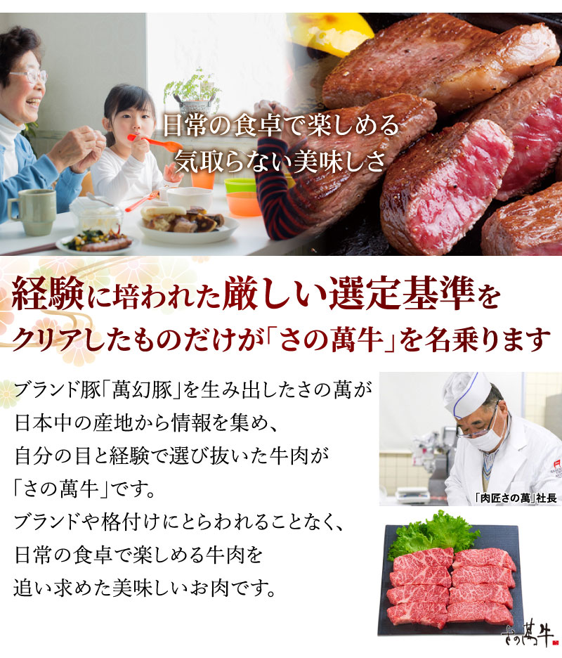 ブランド豚「萬幻豚」を生み出したさの萬が、日本中の産地から情報を集め、自分の目と経験で選び抜いた牛肉が「さの萬牛」です。ブランドや格付けにとらわれることなく、日常の食卓で楽しめる牛肉を追い求めた美味しいお肉です。