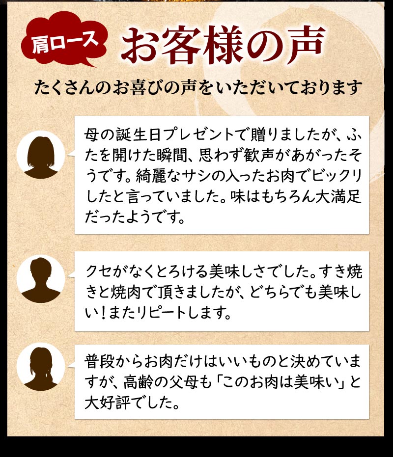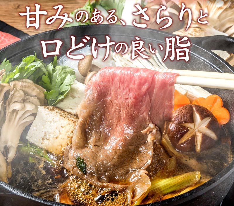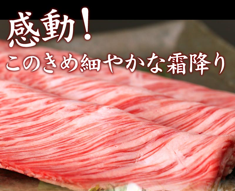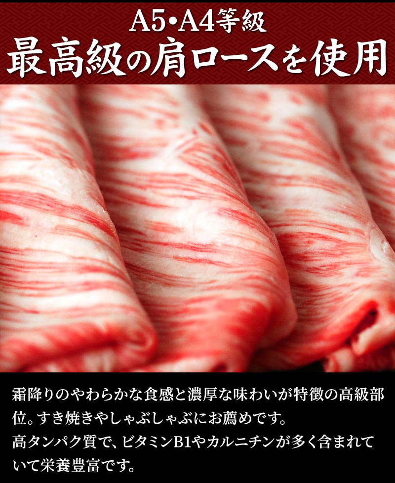 A5・A4黒毛和牛の高級部位、肩ロースを豪華な大判サイズで丁寧にスライス。霜降りのやわらかな食感と濃厚な味わいが特徴で、すき焼きやしゃぶしゃぶにお薦めです。