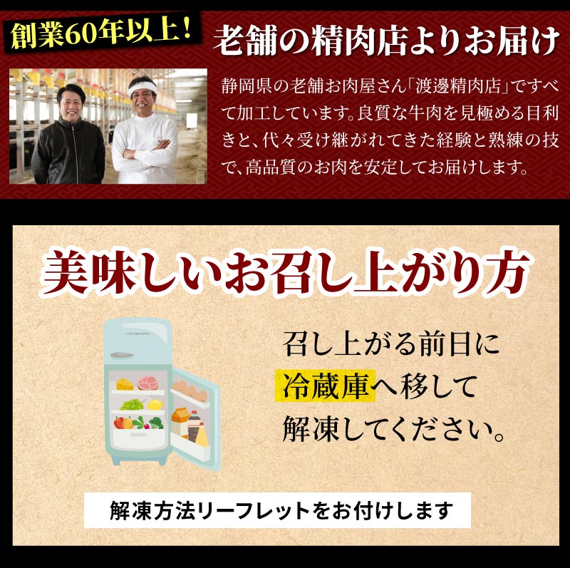 創業60年以上、静岡の老舗お肉屋さん「渡邊精肉店」よりお届けします。解凍方法リーフレット付き。