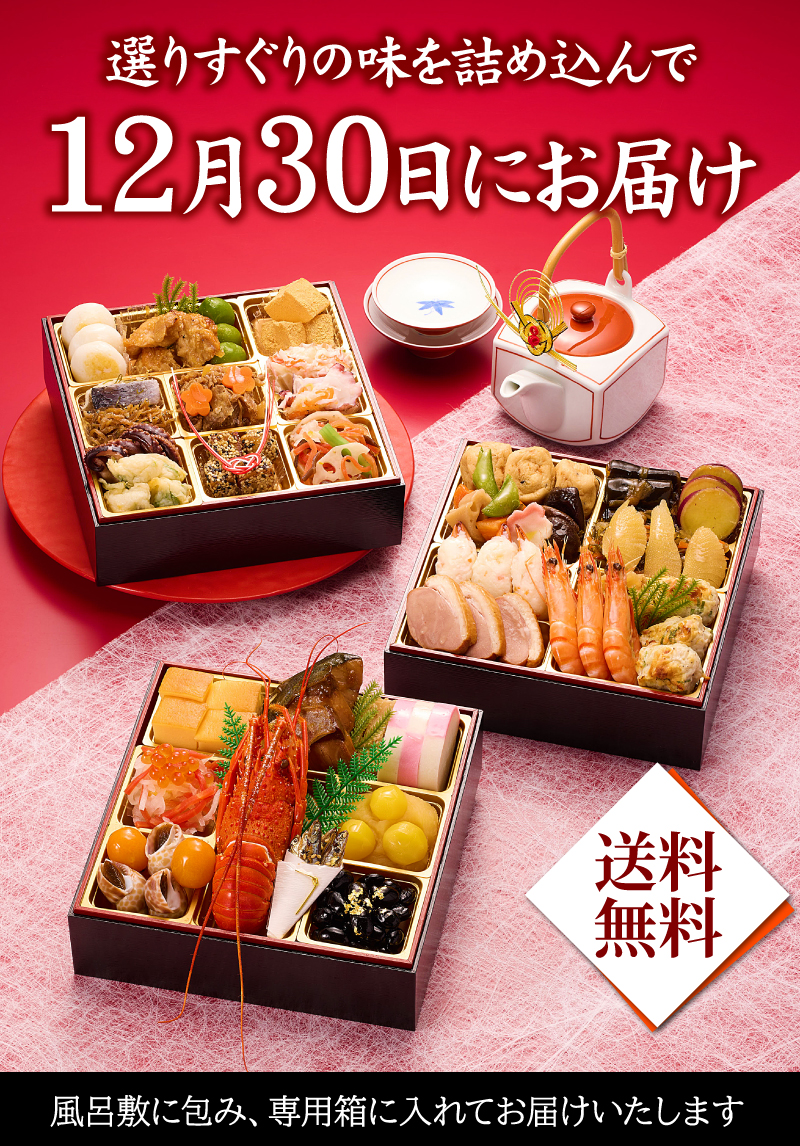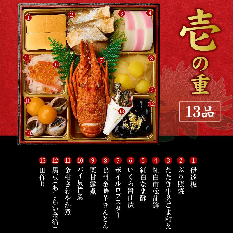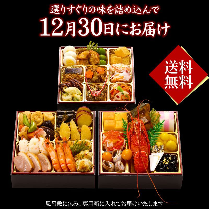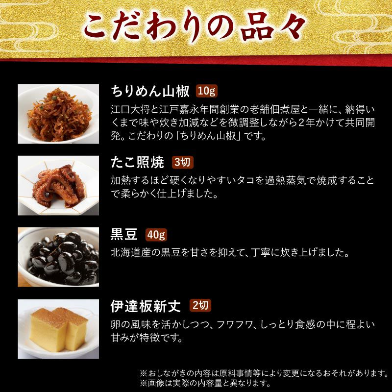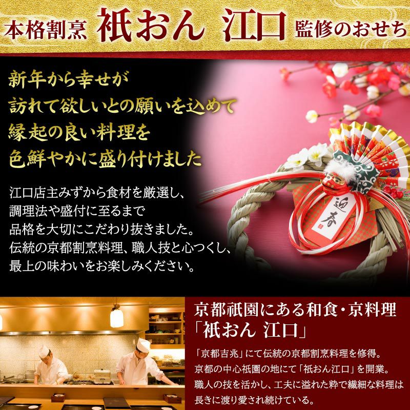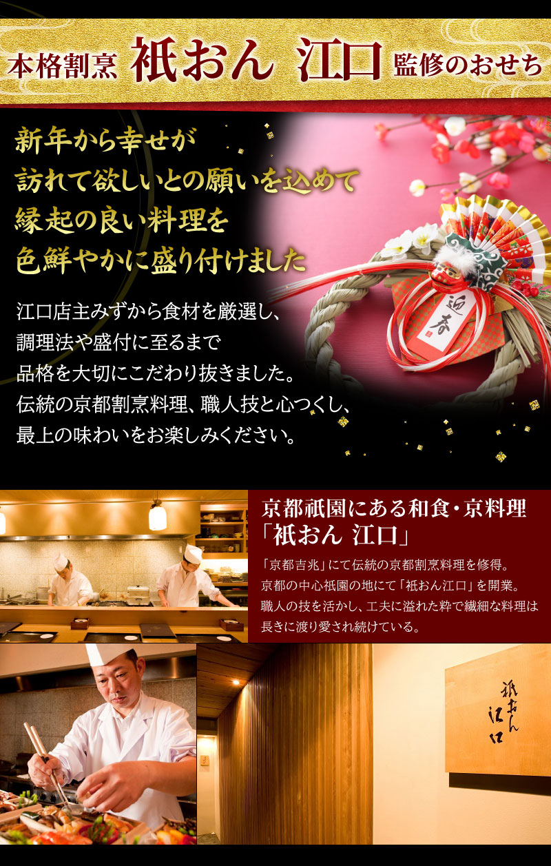 お節の定番献立とロブスターを1尾盛り込んだお得で華やかな三段重お節です。核家族構成に合わせた3~4人前の3段重。代表的な献立は祇おん江口オリジナルの『ちりめん山椒』、産地・品種・製法にこだわりがある『たこ照焼』『黒豆』『伊達板新丈』等です。京都吉兆で修行した江口大将の料理感に、家庭的な要素を加えて組み合わせたメニューで様々な味をお楽しみいただけます。