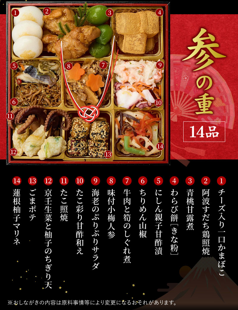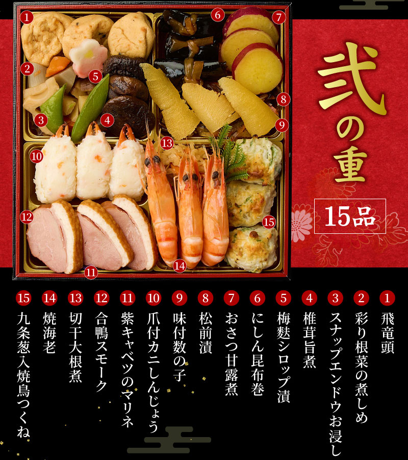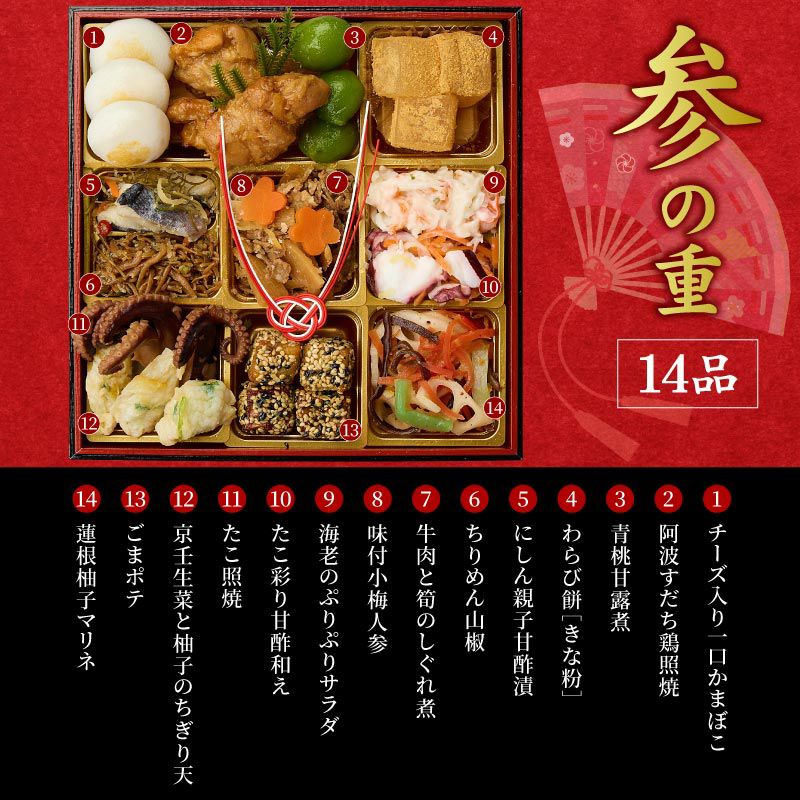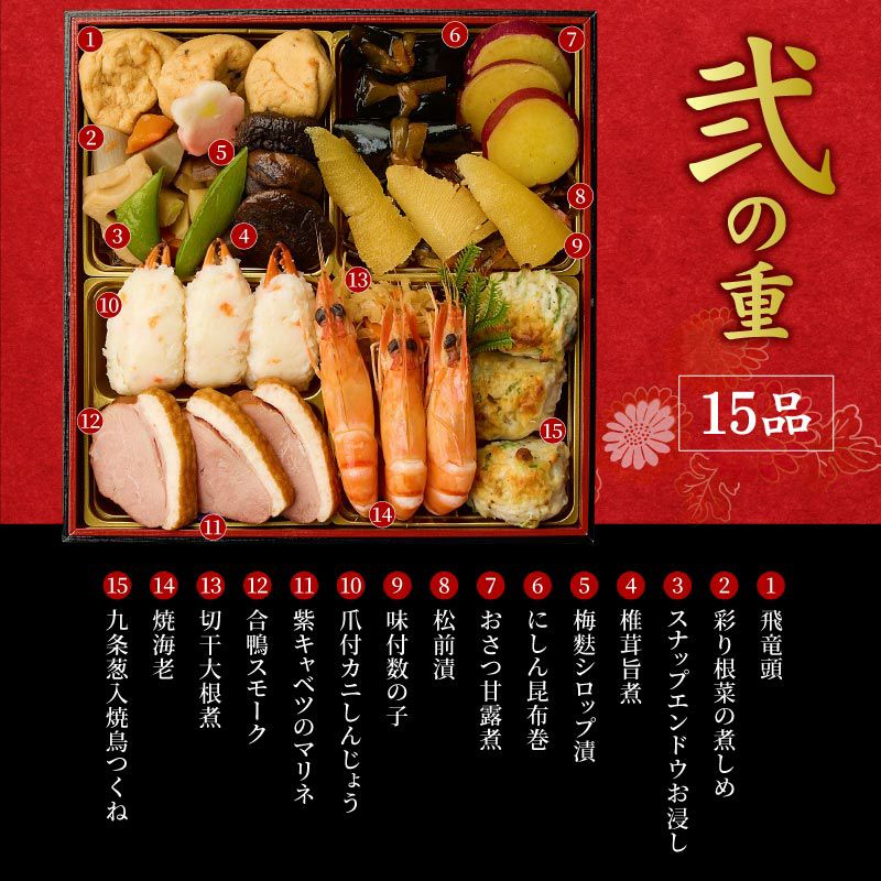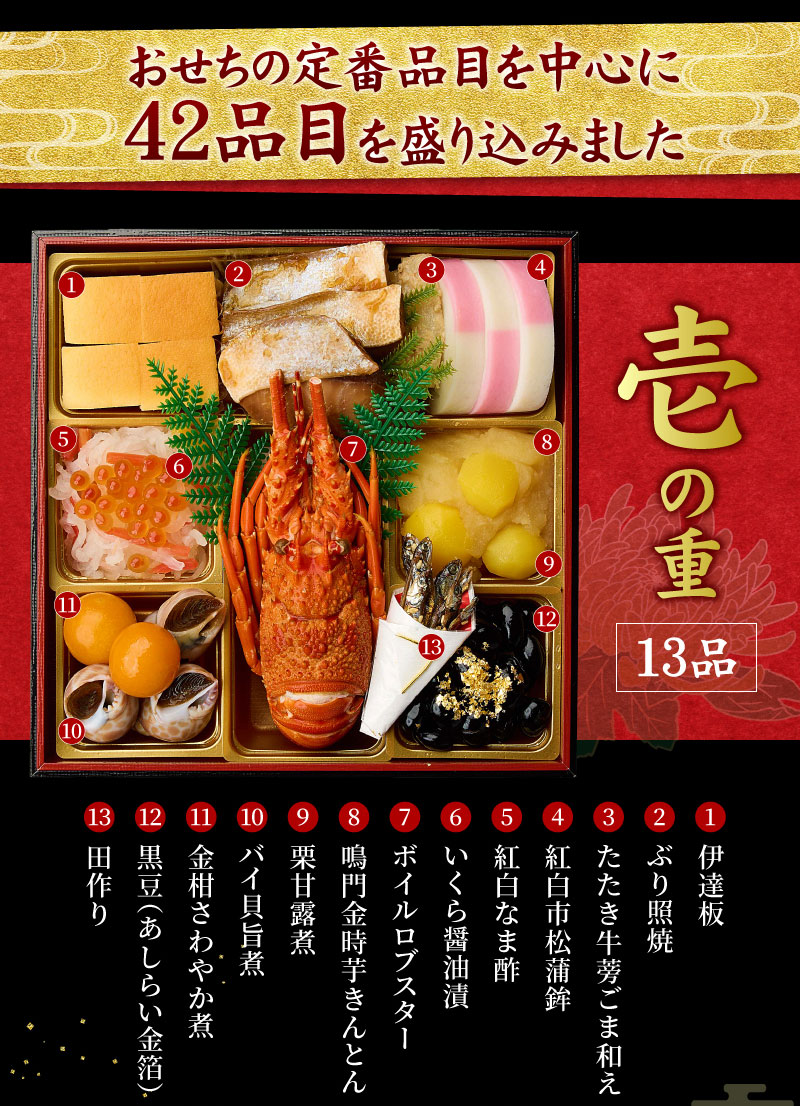 お節の定番献立とロブスターを1尾盛り込んだお得で華やかな三段重お節です。核家族構成に合わせた3~4人前の3段重。代表的な献立は祇おん江口オリジナルの『ちりめん山椒』、産地・品種・製法にこだわりがある『たこ照焼』『黒豆』『伊達板新丈』等です。京都吉兆で修行した江口大将の料理感に、家庭的な要素を加えて組み合わせたメニューで様々な味をお楽しみいただけます。