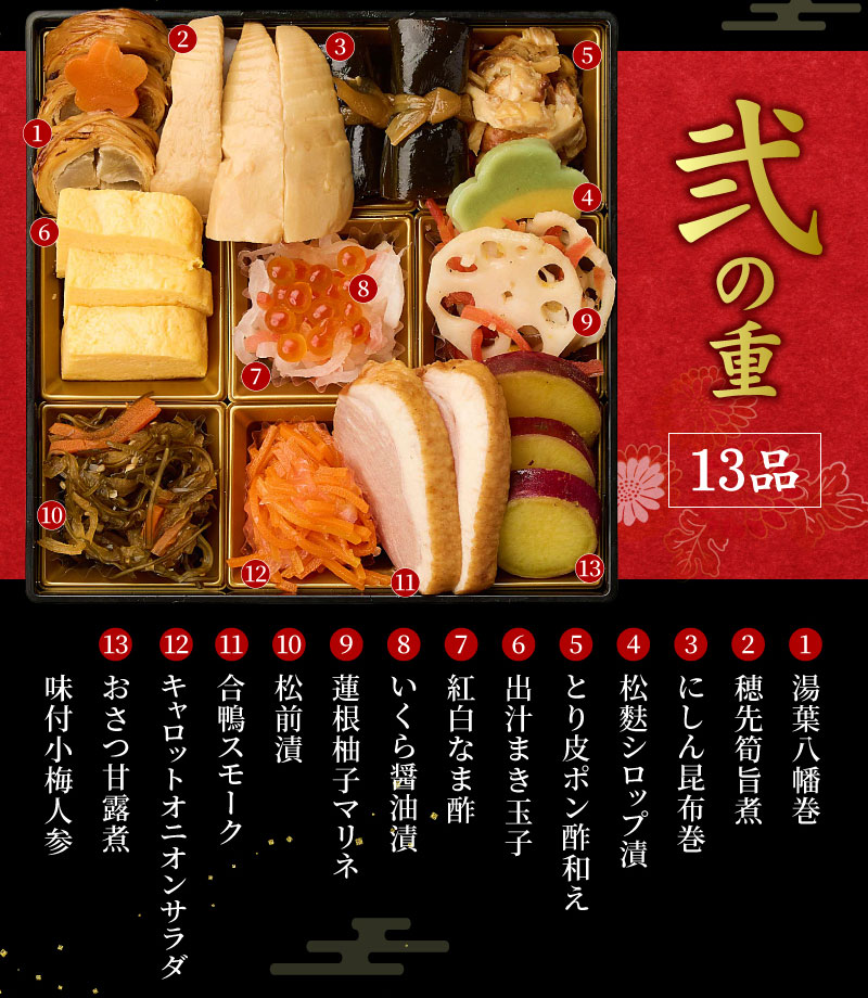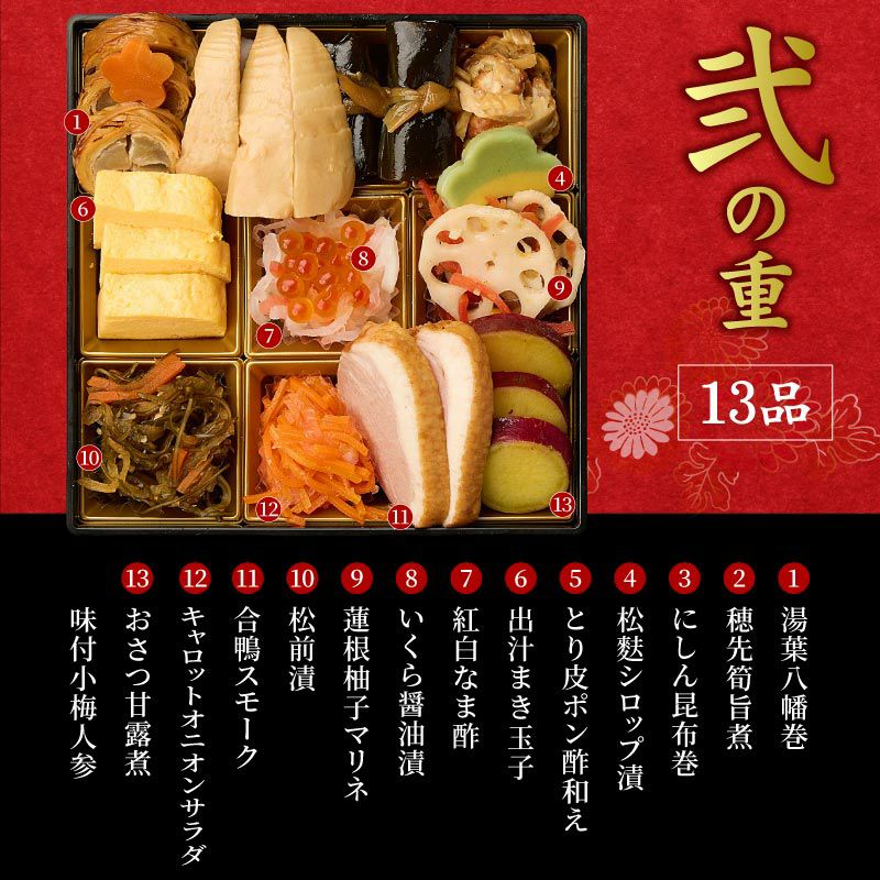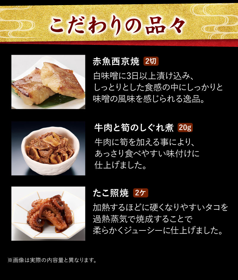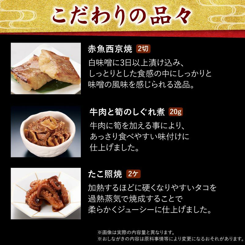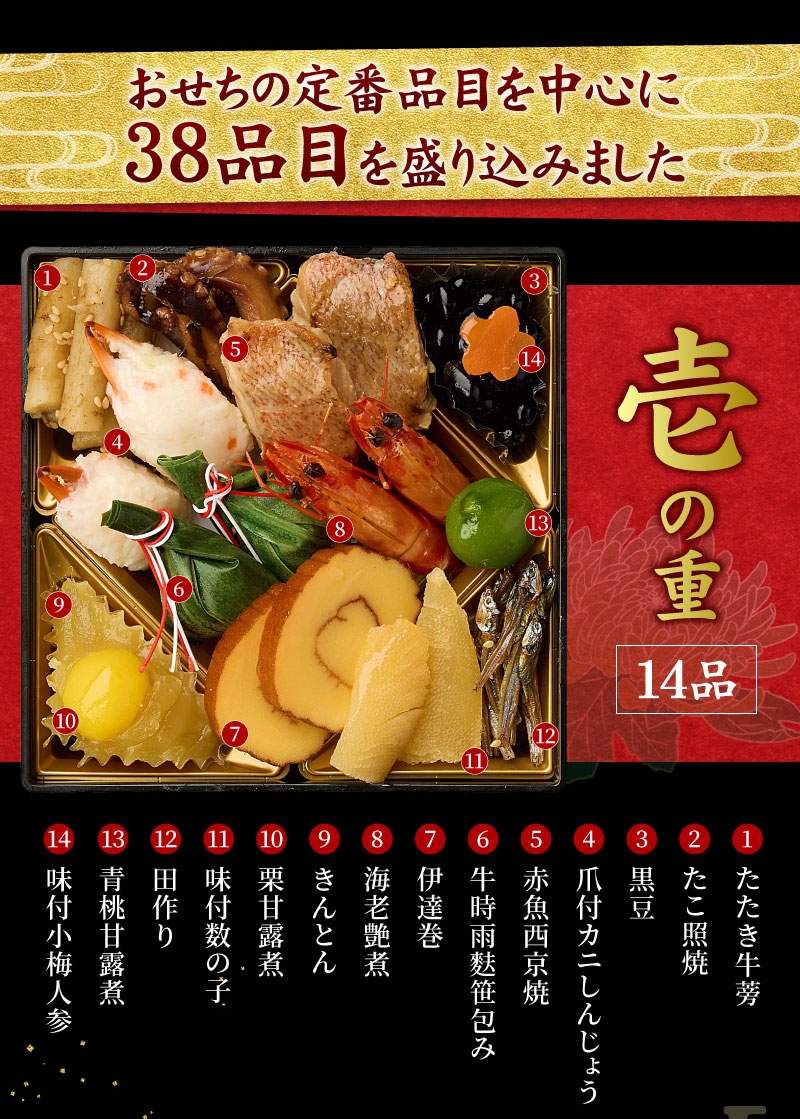 お手軽に本格おせちをお楽しみいただけるよう、コンパクトなお重に、色とりどりの料理38品を盛り込みました。家族みんなが健康で明るい一年を過ごせますようにという願いをこめたおせち料理です。