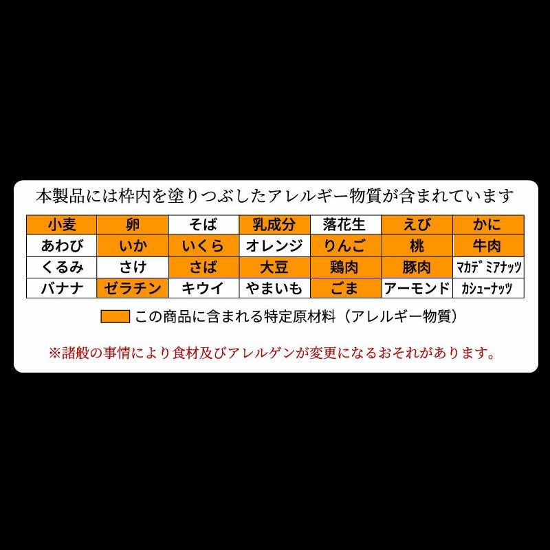 小麦、卵、乳成分、えび、かに、いか、いくら、りんご、桃、牛肉、さば、大豆、鶏肉、豚肉、ゼラチン、ごま |