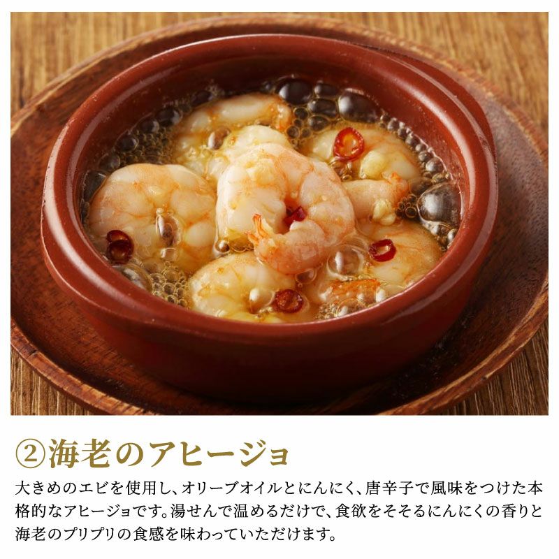 大きめのエビを使用し、オリーブオイルとにんにく、唐辛子で風味をつけた本格的なアヒージョです。湯せんで温めるだけで、食欲をそそるにんにくの香りと海老のプリプリの食感を味わっていただけます。