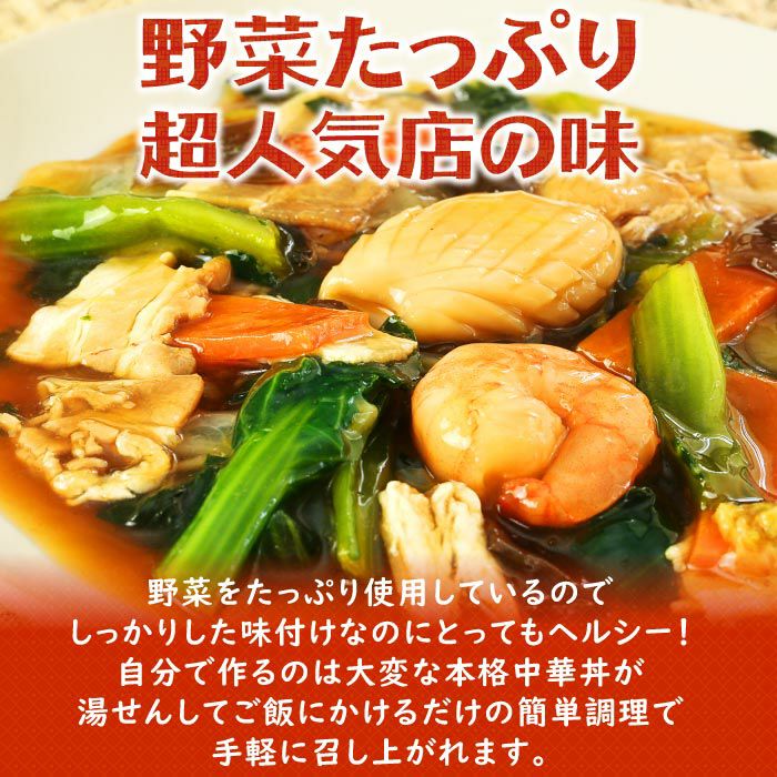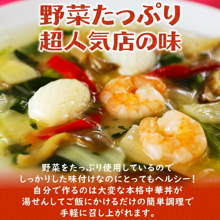 他の画像を見る 野菜たっぷり!ご飯にかけるだけで本格海鮮中華丼 青山シャンウェイ 彩り野菜の中華丼 塩味 10食セット 簡易梱包 クール便でお届け 販売価格 ¥ 4,980 税込 カートに入れる お気に入りに登録する